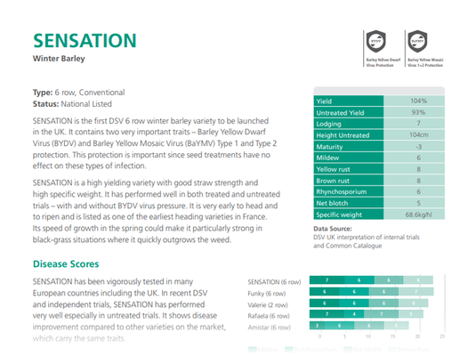 SENSATION is the first DSV 6 row winter barley variety to be launched in the UK. It contains two very important traits – Barley Yellow Dwarf Virus (BYDV) and Barley Yellow Mosaic Virus (BaYMV) Type 1 and Type 2 protection. This protection is important since seed treatments have no effect on these types of infection.