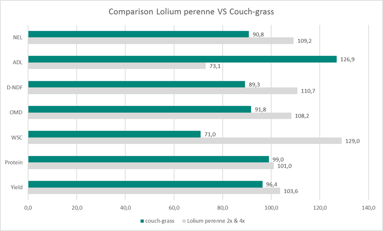 Many weeds of grassland such as common couch are edible for livestock and so judging the productivity of your land based on the species present alone is difficult. To understand how couch will affect the grassland manager DSV has made an investigation on our forage innovation trial fields, measuring the yield and analysing the forage quality of weed species and comparing them to modern varieties.