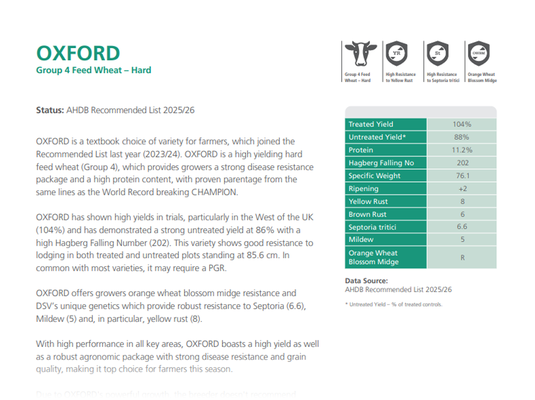 OXFORD is a textbook choice of variety for farmers, which joined the Recommended List last year (2023/24). OXFORD is a high yielding hard feed wheat (Group 4), which provides growers a strong disease resistance package and a high protein content, with proven parentage from the same lines as the World Record breaking CHAMPION.