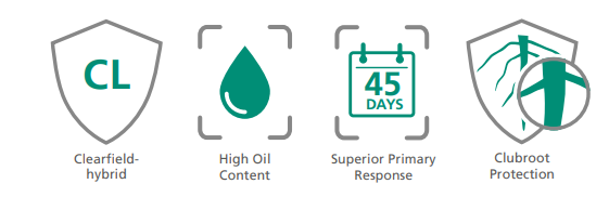 Crazy CR (CL) sets a new benchmark in hybrid oilseed rape, delivering the joint highest Gross Output and Seed Yield on the AHDB Descriptive List for spring oilseed rape with an impressive score of 103. Crazy CR (CL) has a high oil content 43.5 %; it has a similar height to all of the other spring rapes on the list, with a score of [7] and has a score of 7 for flowering. It has a 5 for maturity, which puts it in good standing for an early harvest. Crazy CL has performed well in the trial from 2023 to 2025. As the first variety in the UK to combine clubroot protection with Clearfield® herbicide tolerance, it offers a unique dual solution for growers battling clubroot and brassica weed pressure or either. This groundbreaking variety ensures strong performance where it’s needed most, offering not only robust agronomic traits but also a powerful tool for spring weed control in Clearfield® cropping systems.